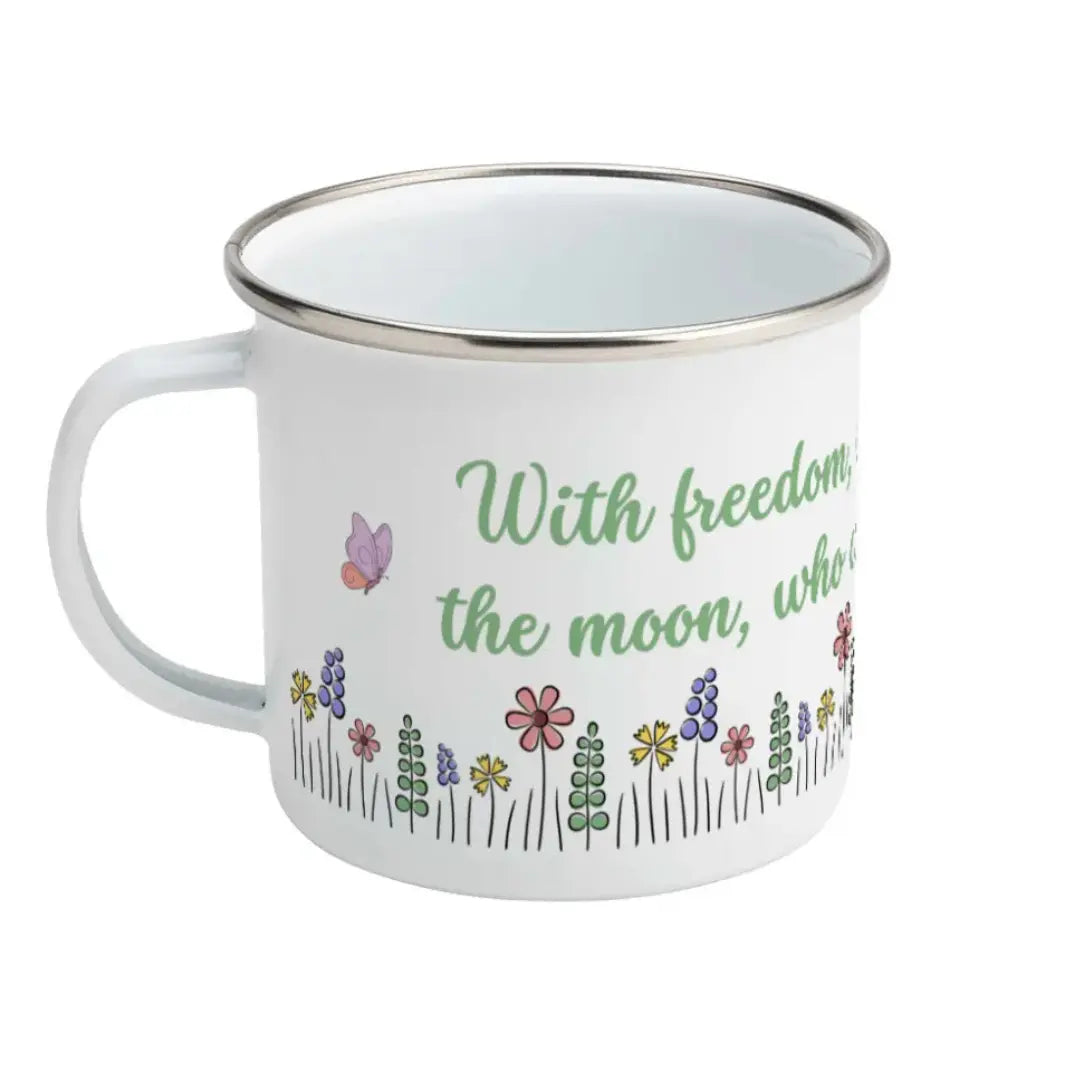 Enamel Book Mug "With Freedom, Books, Flowers and the Moon"